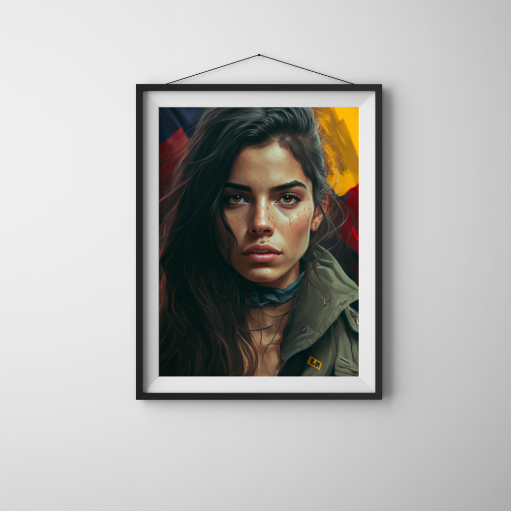 Sara, a Colombian beauty and a FARC resistance fighter, is our first AI-generated digital art piece. With her unique blend of traditional and modern features, she represents the diversity of Colombian culture and the strength of its fighters.